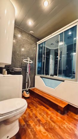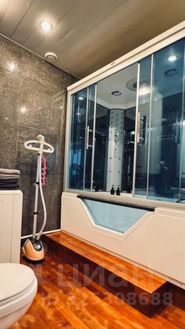 Ванная комната: душевая кабина, банные полотенца, фен и косметические средства (мыло, гель для душа, шампунь и т. д.).