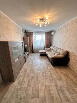 Квартира с дизайнерским ремонтом, полностью меблирована, готова к проживанию. В кухне и комнатах есть необходимая современная мебель. Установлена вся необходимая техника: кондиционер, холодильник, телевизор, стиральная и посудомоечная машины. Санузел — отдельный, с ванной. Также есть лоджия, где можно устроить уютное место для отдыха.