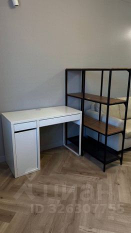 В гостиной: диван, стеллаж, письменный стол