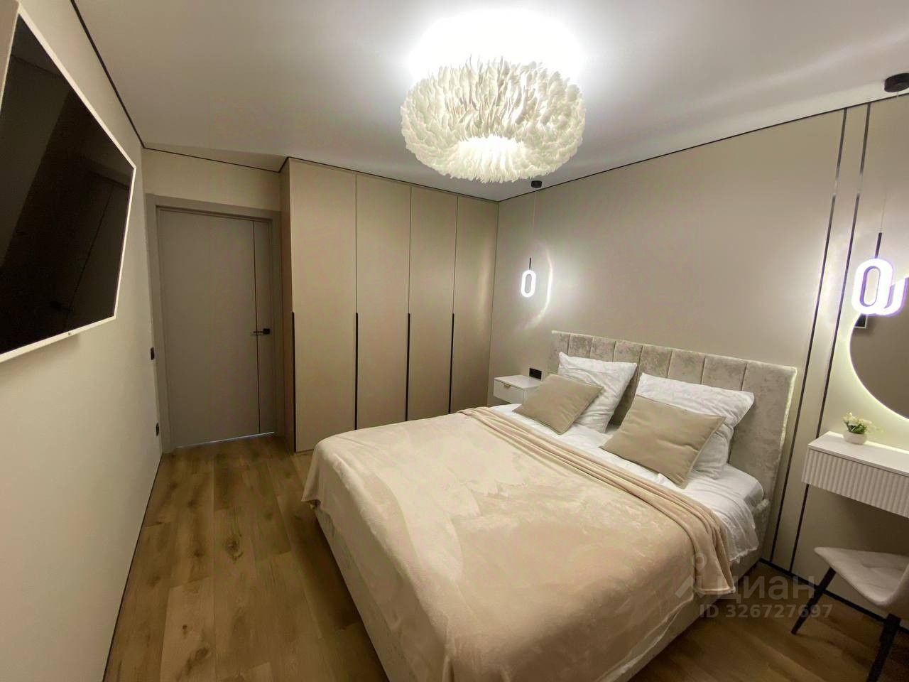 4 спальных места - широкая кровать и раскладной диван в зале. Вместительные шкафы для вещей.
