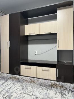 В квартире базовый набор мебели: диван, комод, гостиная стенка, обеденный стол и кухонный гарнитур. Из техники — стиральная машинка, холодильник, микроволновка и чайник.