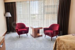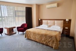 Оснащения номера: Плазменный телевизор, кондиционер, телефон, бра, торшер, мини-холодильник, чайник, современный стеклопакет, комплект портьер, халат, встроенный платяной шкаф, зеркало в полный рост, вода питьевая без газа, чай/кофе/сахар, одноразовые махровые тапочки, одноразовые бумажные салфетки, комплект посуды, информационная папка для гостя.