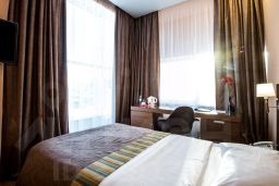 Оснащения номера: Плазменный телевизор, кондиционер, телефон, бра, торшер, мини-холодильник, чайник, современный стеклопакет, комплект портьер, халат, встроенный платяной шкаф, зеркало в полный рост, вода питьевая без газа, чай/кофе/сахар, одноразовые махровые тапочки, одноразовые бумажные салфетки, комплект посуды, информационная папка для гостя.