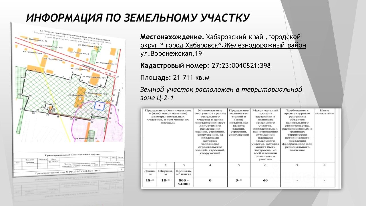 Продается земля в собственности , под здание и сооружение автовокзала . Хабаровский край г.Хабаровск , ул. Воронежская номер земельного участка 19,площадь 21711 кв.м. С НДС.