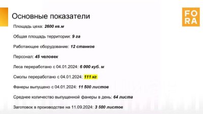 За период с 04.01.2024 года было переработано 6 000 куб. м леса, 111 кг смолы и выпущено 11 500 листов фанеры, что составляет в среднем 64 листа фанеры в день. На текущую дату в производстве имеется 3 500 листов заготовок.