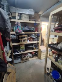 В конце мастерской освещенная складская зона. Стеллажи проектировались для размещения множества разнообразных вещей. Так же есть доп. места хранения над рабочими верстаками и обеденной зоной