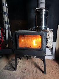 Отопление жидкостное. Нагревается от печки. Печка с огнеупорным стеклом на дровах или угле.