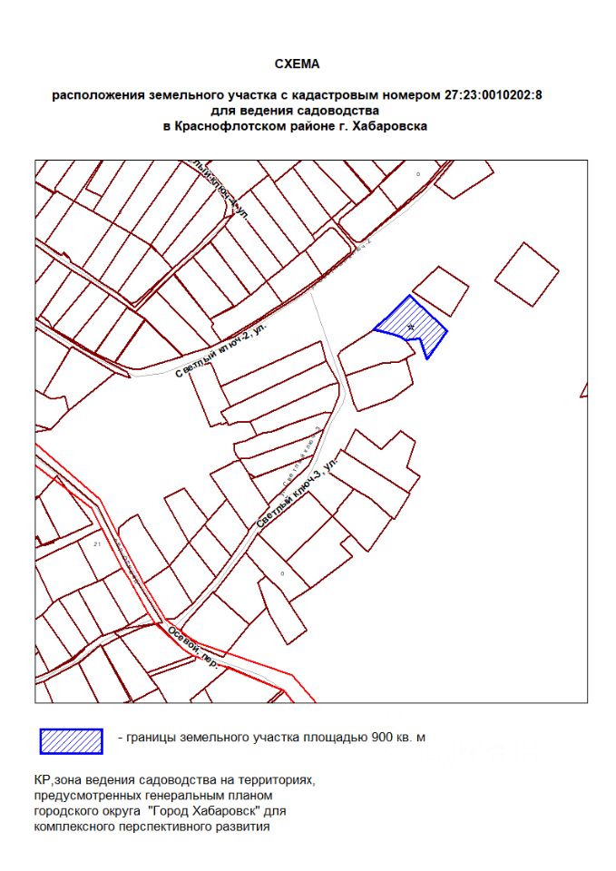 Земельный участок с местоположением: Хабаровский край, г. Хабаровск, р-н Краснофлотский, с/т "Светлый ключ", уч. 295. Вид разрешенного использования Ведение садоводства. Кадастровый номер - 27:23:0010202:8 Площадь - 900 кв. м Форма собственности муниципальная (дата, номер регистрации: от 06.04.2006 27-27-01/032/2006-057) Категория земель - земли населенных пунктов.