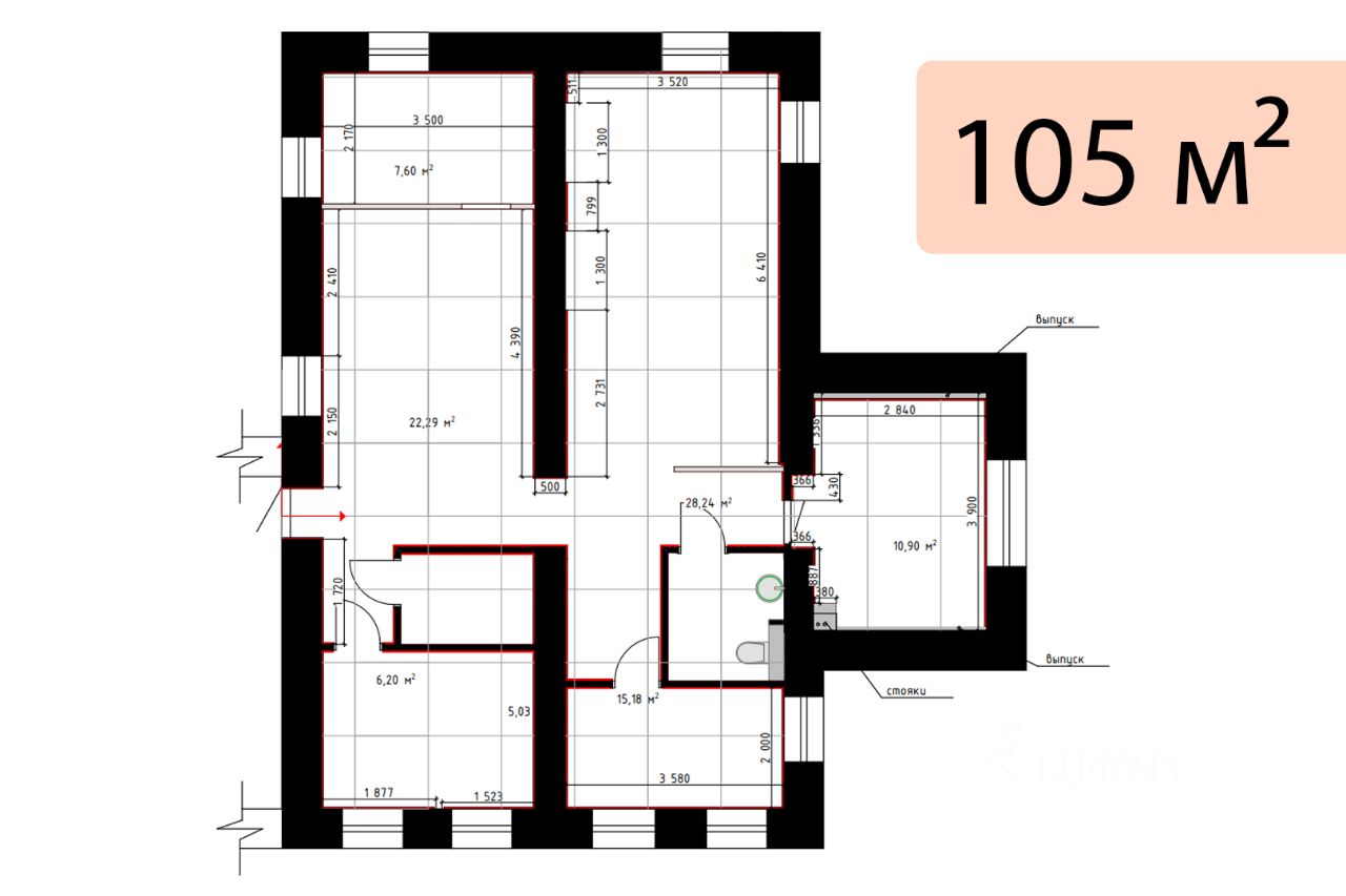 • Площадь: 105 м2 (2/4 этаж, потолки 3 м)