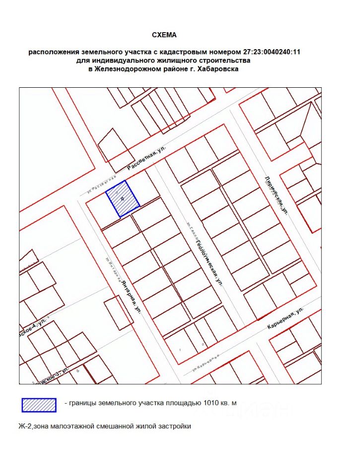 Земельный участок с с местоположением: Хабаровский край, г. Хабаровск, ул. Рассветная, дом 4. Вид разрешенного использования строительство индивидуального жилого дома. Кадастровый номер - 27:23:0040240:11 Площадь - 1010 кв. м Форма собственности неразграниченная. Категория земель - земли населенных пунктов.