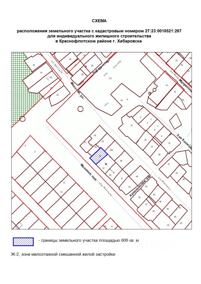 Земельный участок с местоположением: Хабаровский край, г. Хабаровск, пер. Моховой, земельный участок 25. Вид разрешенного использования для индивидуального жилищного строительства. Кадастровый номер - 27:23:0010521:267 Площадь 606 кв. м Форма собственности неразграниченная. Категория земель - земли населенных пунктов.