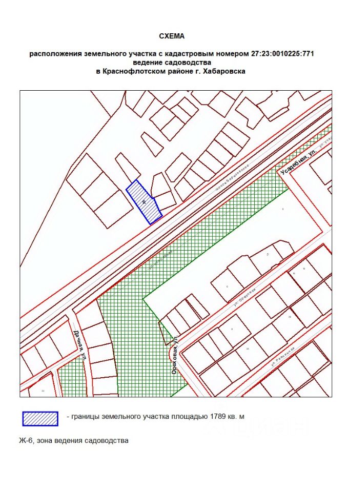 Земельный участок с местоположением: Российская Федерация, Хабаровский край, городской округ "Город Хабаровск", город Хабаровск, шоссе Березовское, земельный участок 5. Вид разрешенного использования ведение садоводства. Кадастровый номер - 27:23:0010225:771 Площадь - 1789 кв. м Форма собственности неразграниченная. Категория земель - земли населенных пунктов.