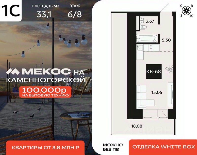 Квартира в отделке WhiteBox. Действует акция - квартира в ипотеку без первоначального взноса. В наших ЖК можно купить квартиру от 3.6 млн.р, а на студии сейчас подарок - 100 тыс. руб на покупку бытовой техники.