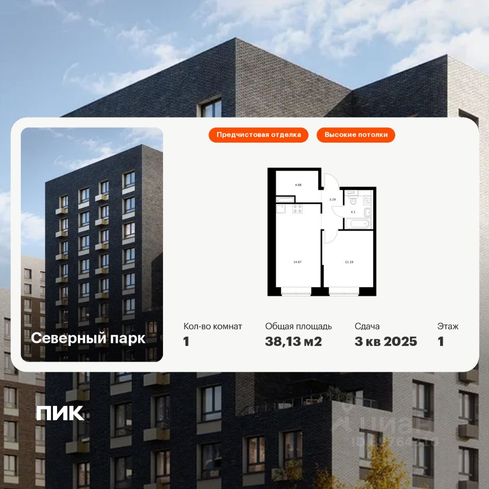 Продаётся 1-комн. квартира площадью 38,13 кв.м на 1 этаже 10 этажного дома (Корпус 1, Секция 2) проекта ПИК Северный парк. Светлый просторный подъезд на уровне земли, функциональная планировка, большие окна, предчистовая отделка.