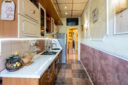 Материал пола также разный- на кухне-керамогранит, частично (в зале) сохранен и покрыт лаком деревянный старинный паркет, в коридоре-ламинат. На кухне установлена система теплого пола.