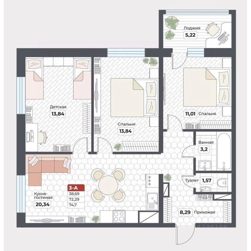 — спальня 11,01 м² с выходом на просторную лоджию 5,22 м²;