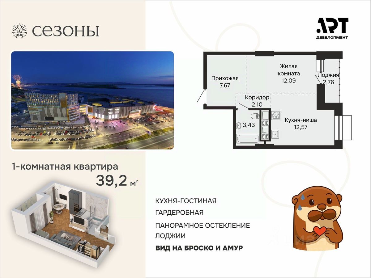 Осенние скидки! Выгода до 1,9 миллиона рублей. Стартовые цены - от 7,5 миллионов рублей. Квартира 39,24 м2 свободной планировки с видами на Амур и Броско.