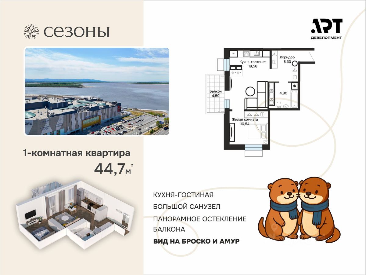 Квартира 45,34 кв.м свободной планировки с видами на город и Амур.