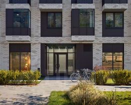 Входы в подъезды "Северного парка" мы сделаем на уровне земли для комфортного перемещения по территории квартала любым способом: пешком, на самокате или с коляской. Благодаря панорамному остеклению, которое пропускает много естественного света, первые этажи будут просторные и светлые.