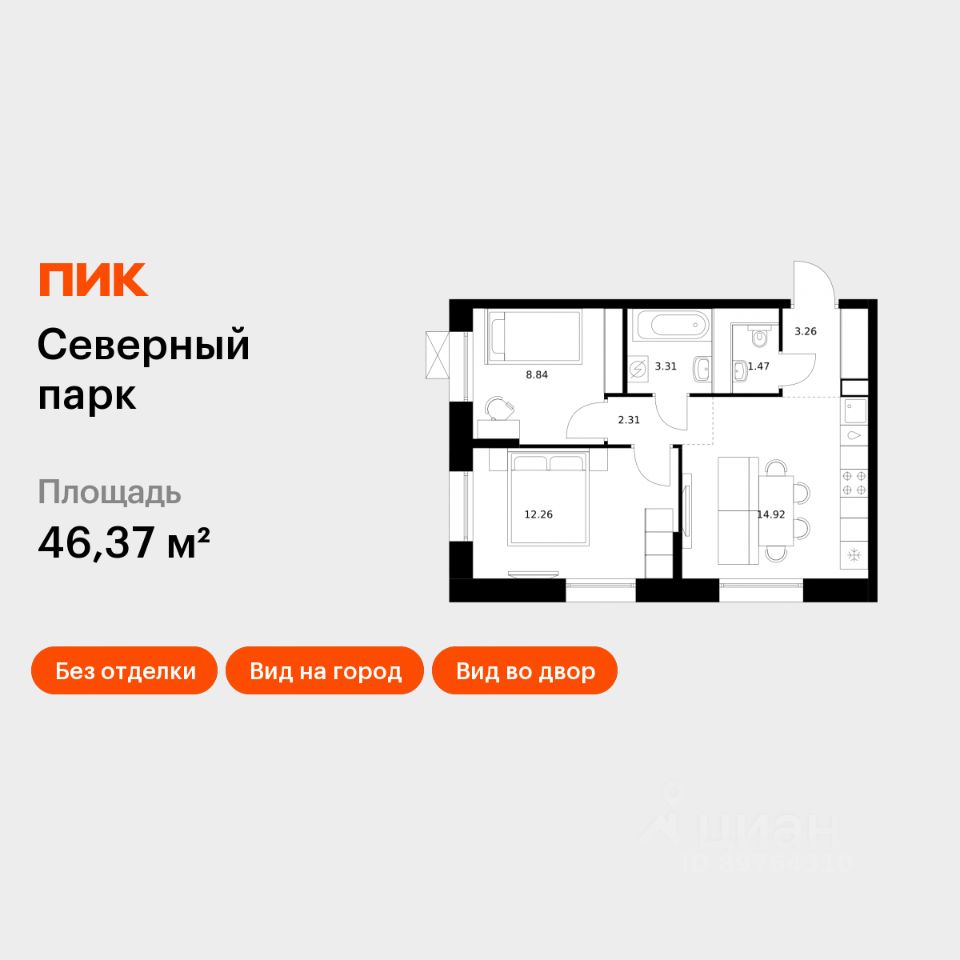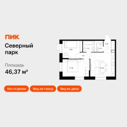 Продаётся 2-комн. квартира площадью 46,37 кв.м на 9 этаже 10 этажного дома (Корпус 10, Секция 2) проекта ПИК Северный парк. Светлый просторный подъезд на уровне земли, функциональная планировка, большие окна, без отделки.