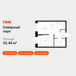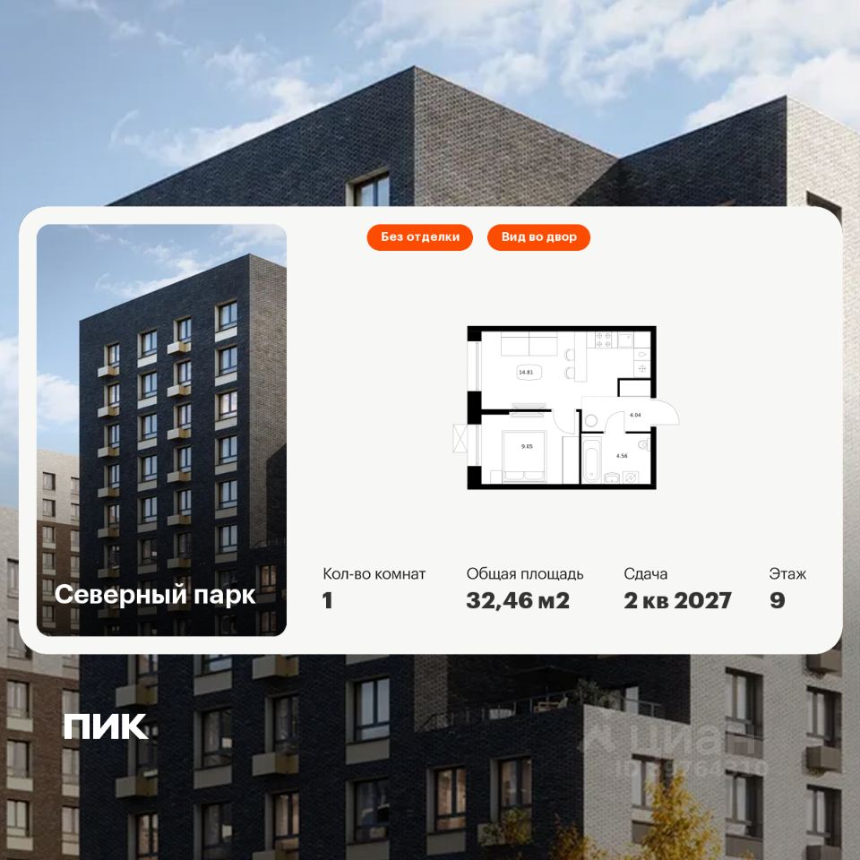 Продаётся 1-комн. квартира площадью 32,46 кв.м на 9 этаже 10 этажного дома (Корпус 10, Секция 1) проекта ПИК Северный парк. Светлый просторный подъезд на уровне земли, функциональная планировка, большие окна, без отделки.