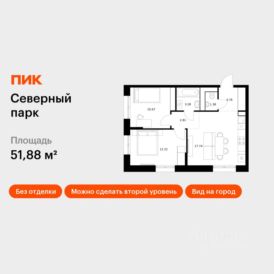 Продаётся 2-комн. квартира площадью 51,88 кв.м на 1 этаже 10 этажного дома (Корпус 12, Секция 1) проекта ПИК Северный парк. Светлый просторный подъезд на уровне земли, функциональная планировка, большие окна, без отделки.