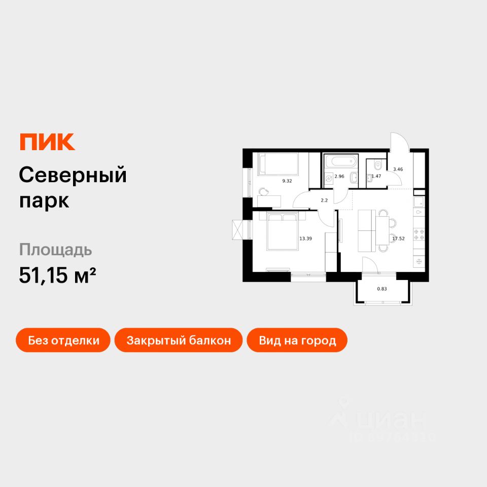 Продаётся 2-комн. квартира площадью 51,15 кв.м на 4 этаже 10 этажного дома (Корпус 12, Секция 1) проекта ПИК Северный парк. Светлый просторный подъезд на уровне земли, функциональная планировка, большие окна, без отделки.