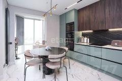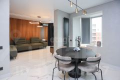 Круглый стол диаметром 1200 мм, столешница выполнена из матового инновационного материала FENIX, который невозможно поцарапать. Основание выполнено из металлических трубок, напоминающих фактуру вельвета. На стене декоративный радиатор с регулировкой температуры. На кухне магнитная трековая система освещения и люстра над столом. На полу керамогранит с теплым полом.