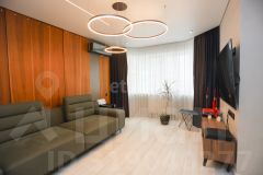 В гостиной: большой комфортный диван, выполненный на заказ, телевизор 65 дюймов. Декоративные стеновые панели в шпоне американского ореха, МДФ панели в эмали. На полу ламинат, потолок с теневым зазором, димерные световые линии, люстра с разными вариантами освещения и накладные LED- светильники. Кондиционер Haier. Подоконник выполнен из кварцевого камня. Радиаторы Роял Термо с регулировкой температуры.