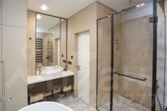 Совмещенный санузел, отделан керамогранитом 120х60, запил плитки выполнен под 45 градусов, теплый пол, парящий потолок с подсветкой и накладными LED- светильниками. На стене световая линия.