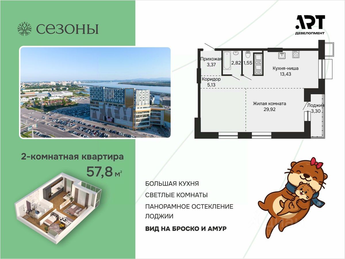 Осенние скидки! Выгода до 1,9 миллиона рублей. Стартовые цены - от 7,5 миллионов рублей. Квартира 58,62 м2 свободной планировки с видами на Амур и Броско.