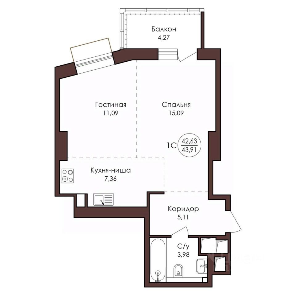 Общая площадь43,91 м²