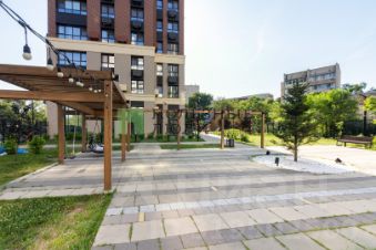 Дворовая территория устроена по принципу "двор без машин" - стоянка автомобилей отделена от остальной территории дома. Имеется детская и спортивная площадки, подъезды выполнены сквозным способом - выход и на улицу и во двор. Входная группа в подъезд не имеет ступенек, что позволяет легко попадать в подъезд с детскими колясками и тд.