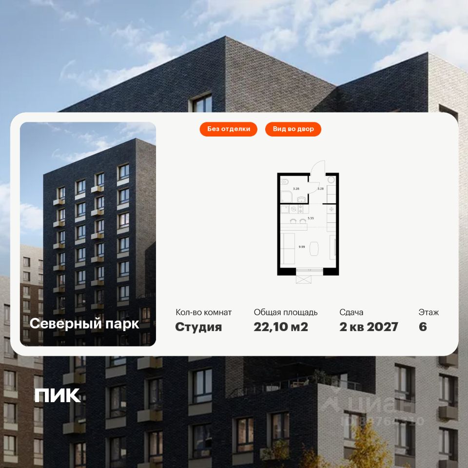 Продаётся квартира-студия площадью 22,1 кв.м на 6 этаже 10 этажного дома (Корпус 12, Секция 1) проекта ПИК Северный парк. Светлый просторный подъезд на уровне земли, функциональная планировка, большие окна, без отделки.