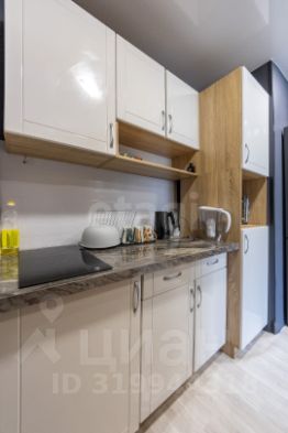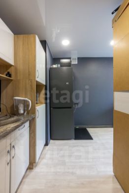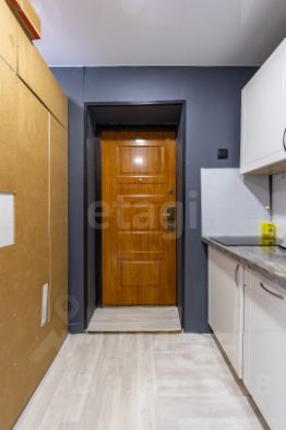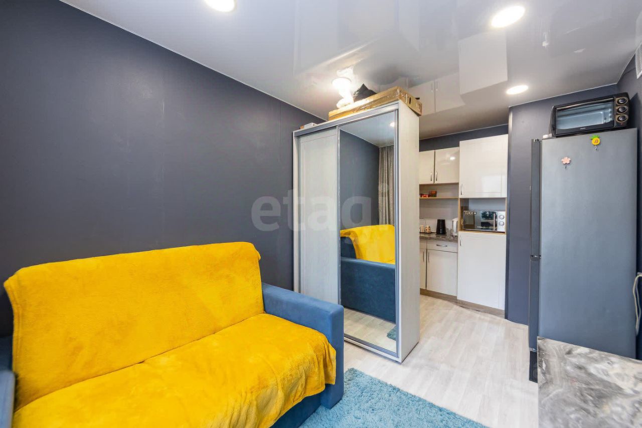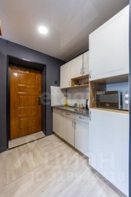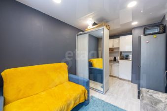 Это готовое пространство для комфортной жизни, где всё продумано до мелочей. В комнате хорошо распределенно пространство. Есть зонирование спального места, рядом рабочее место. Кухонная и входная зона отделены от рабочей и спальной шкафом-купе с большим зеркалом.