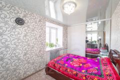 Дальняя комната с двумя окнами, очень светлая, теплая. В ней полностью выровнены стены и пол, натяжной потолок, вся отделка выполнена в светлых тонах. Умело спроектированное пространство позволило установить вместительную гардеробную.