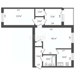 Площадь помещений распределена рационально: кухня-гостиная, две отдельные комнаты и сан.узел позволяют организовать пространство для семьи или использовать одну из комнат в качестве кабинета или гостевой. Окна выходят на две стороны.