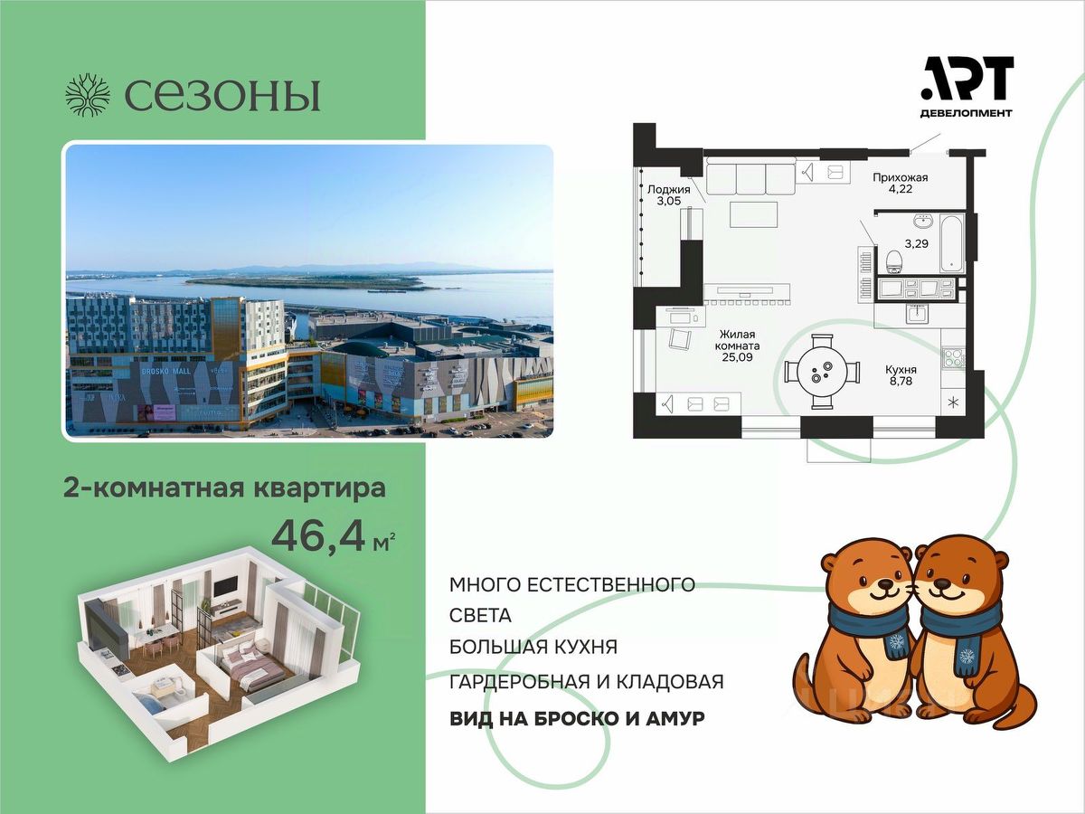 Зимние скидки! Выгода до 1,9 миллиона рублей. Стартовые цены - от 7,5 миллионов рублей. Квартира 47,2 м2 свободной планировки с видами на Амур и Броско.
