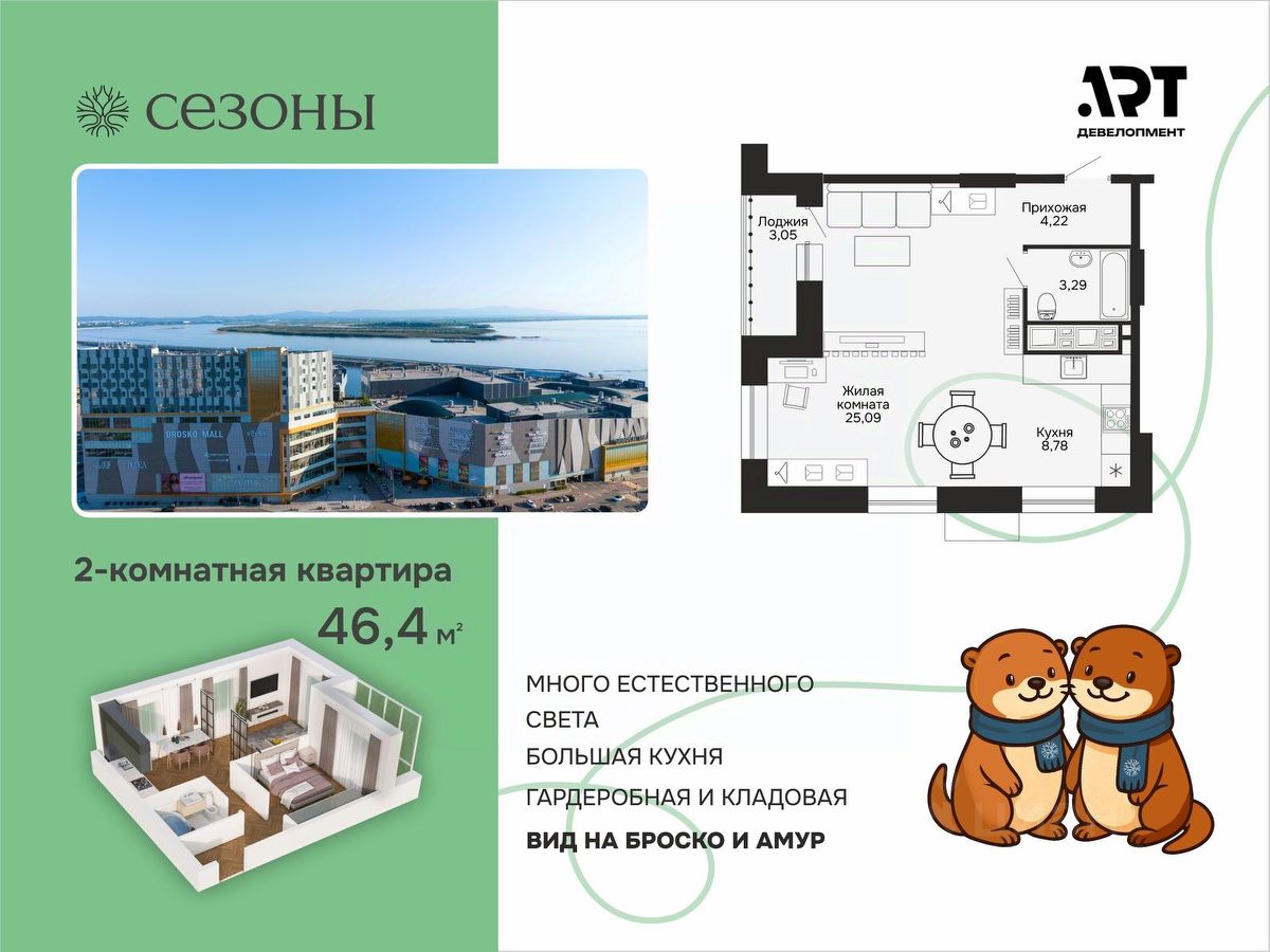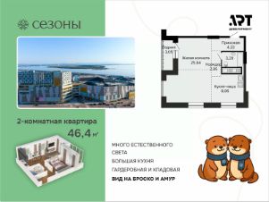 Осенние скидки! Выгода до 1,9 миллиона рублей. Стартовые цены - от 7,5 миллионов рублей. Квартира 45,76 м2 свободной планировки с видами на Амур и Броско.