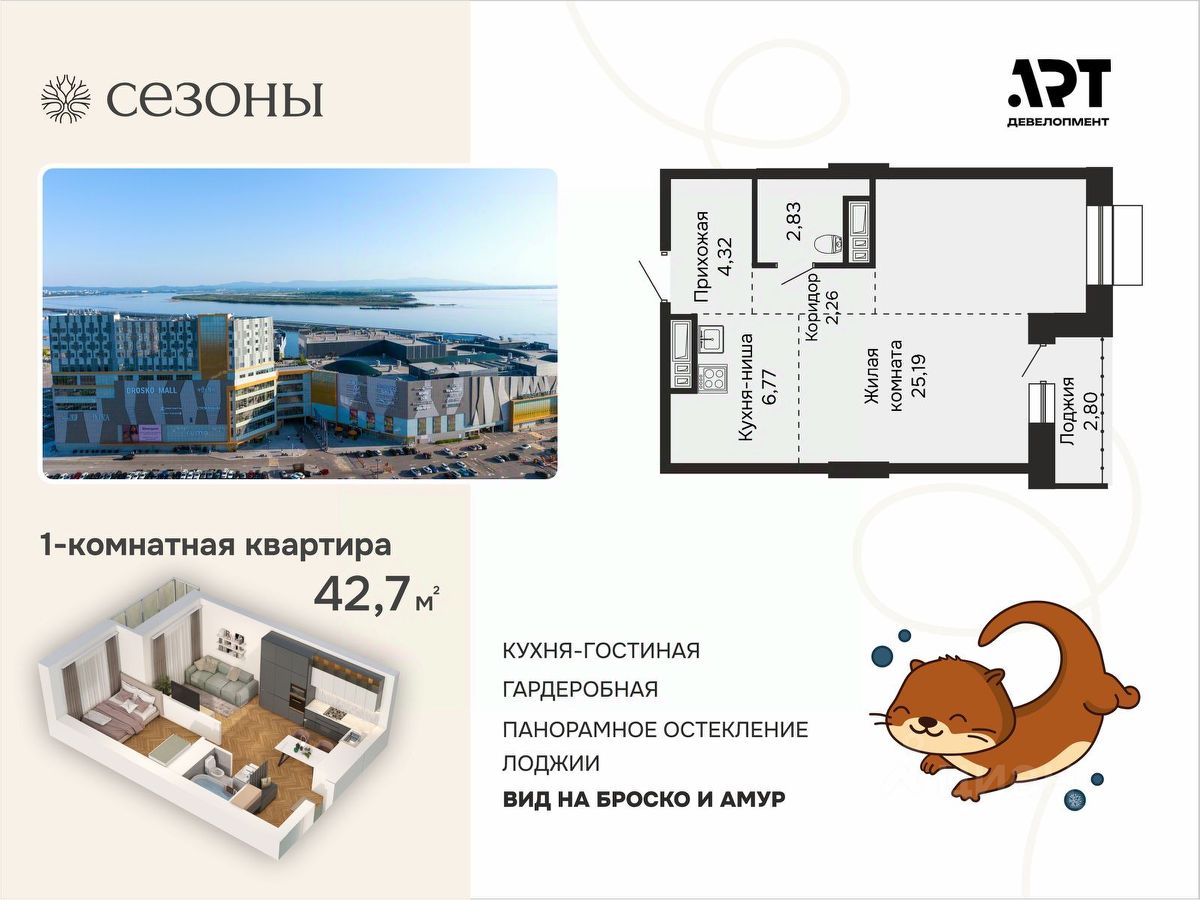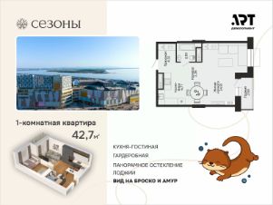 Осенние скидки! Выгода до 1,9 миллиона рублей. Стартовые цены - от 7,5 миллионов рублей. Квартира 42,49 м2 свободной планировки с видами на Амур и Броско.