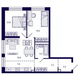 Продаётся 3-комнатная квартира в строящемся доме (Корпус 4), срок сдачи: II-кв. 2028, общей площадью 64.79 кв.м., на 2 этаже. Новый жилой комплекс "Самородный квартал" от Специализированного застройщика "ВИРА 27" расположен в г. Хабаровск по ул. Карла Маркса.