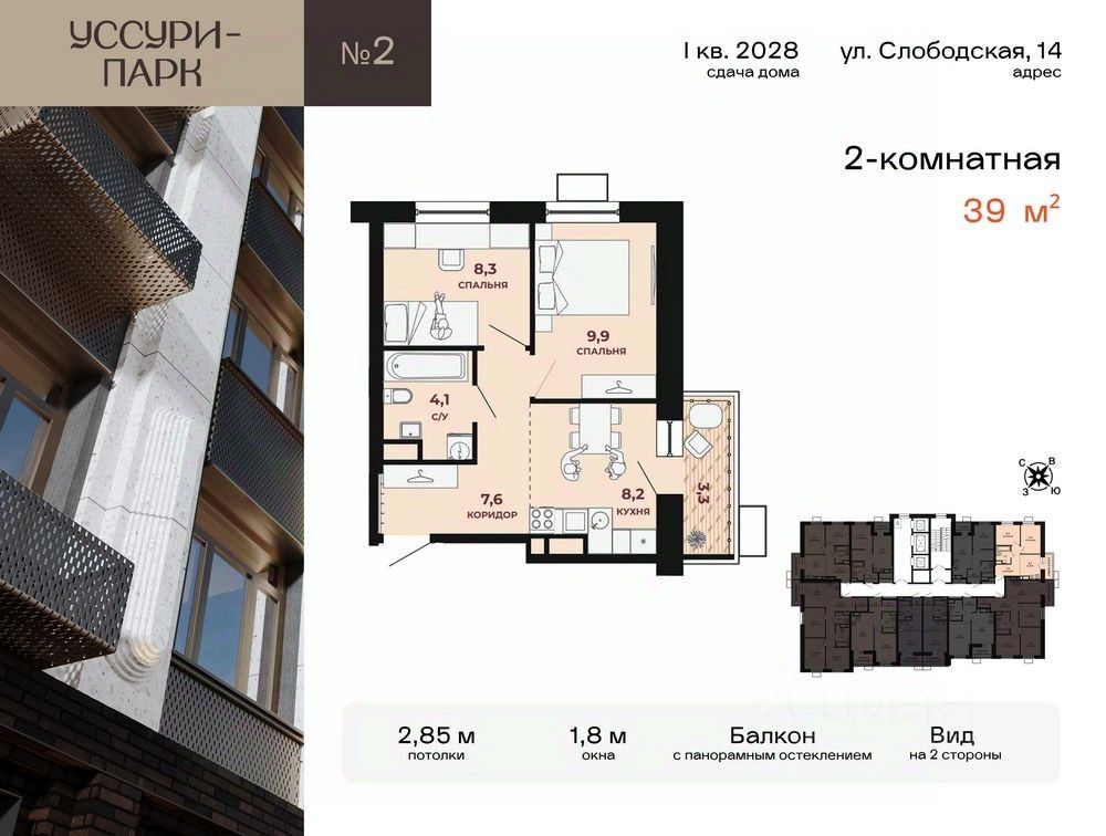 Высокие потолки 2,85 - 3,30 м от стяжки пола, большие окна до 1,8 м и панорамные виды с балкона - все это дает максимум света, легкости и свободного пространства. Окна выходят на 2 стороны