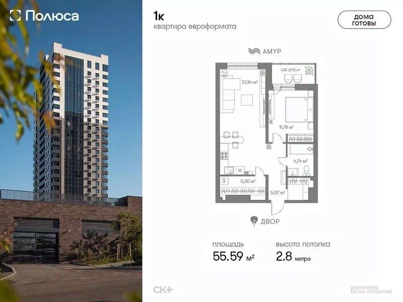 Площадь — 55,50 кв. метра, светлая просторная квартира евроформата с окнами на Амур. Большая лоджия с возможностью утепления и расширения зоны спальни.