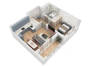• Гостиная "3 в 1": есть выделенная ниша для кухонного гарнитура, а также обеденная зона и пространство для отдыха.