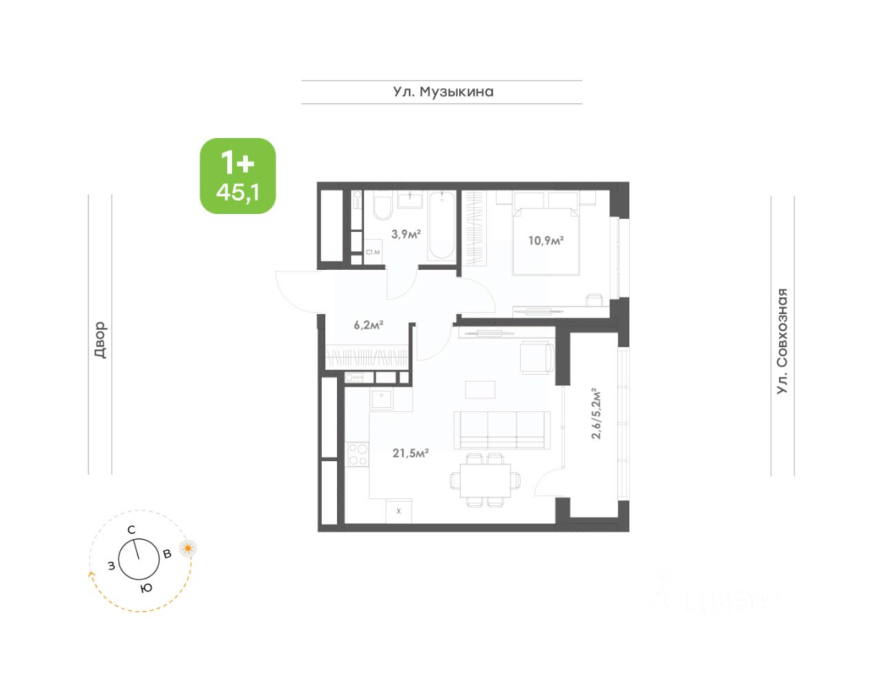 • Гостиная "3 в 1": есть выделенная ниша для кухонного гарнитура, а также обеденная зона и пространство для отдыха.