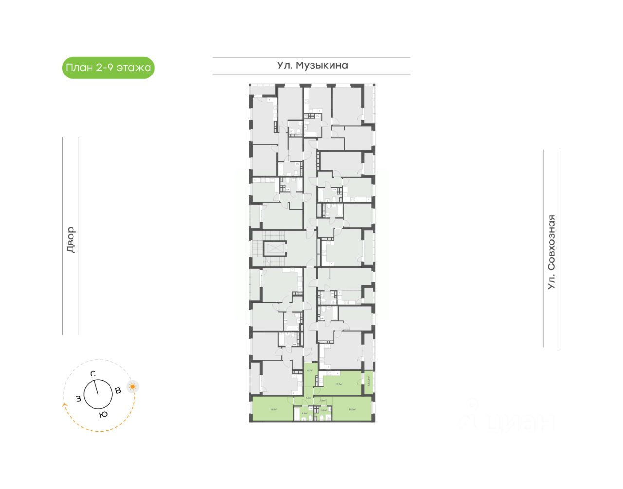 Двухкомнатная квартира евроформата с окнами на 2 стороны света • Просторный холл 9,1 кв.м с нишей под шкаф-купе; • Две спальных комнаты разнесены, и возле каждой есть свой санузел, что удобно для родителей с детьми. В каждой комнате найдется зона для хранения; • Большая кухня-гостиная с обеденной зоной для общения и отдыха всей семьи, а также выход на лоджию с видом на улицу Совхозную; • Удобное решение - два совмещенных санузла.