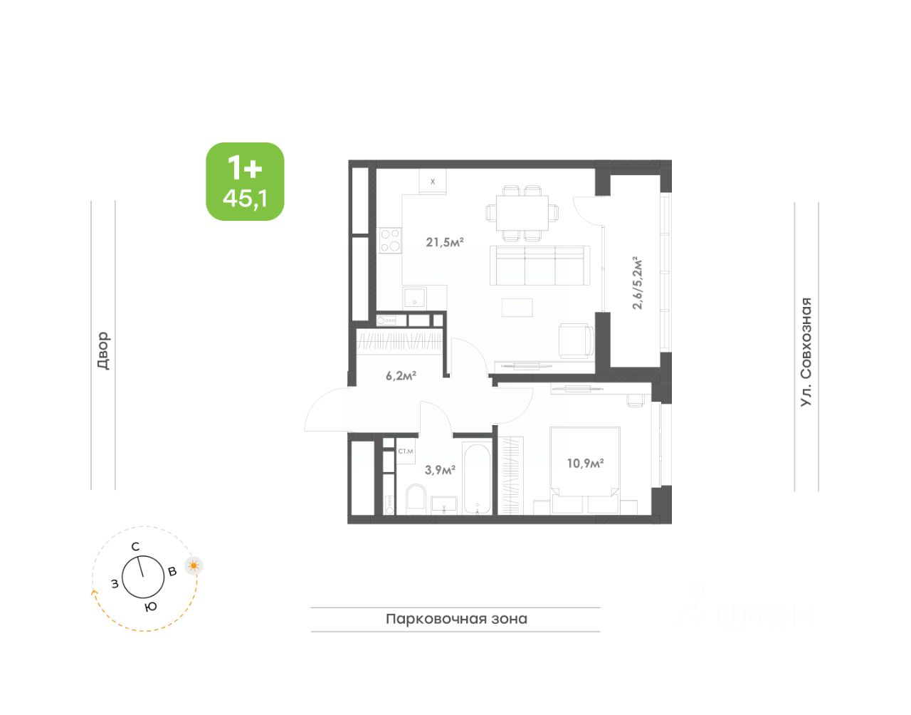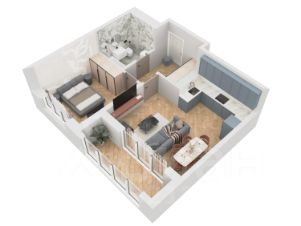 • Гостиная "3 в 1": есть выделенная ниша для кухонного гарнитура, а также обеденная зона и пространство для отдыха.