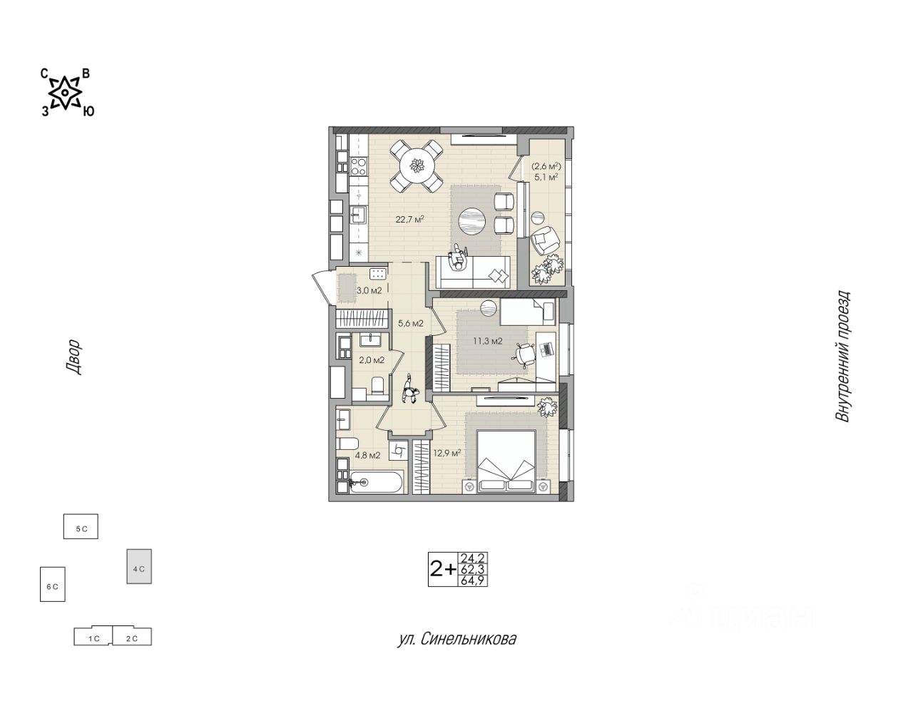 2,5-комнатная квартира для семьи с ребёнком;
