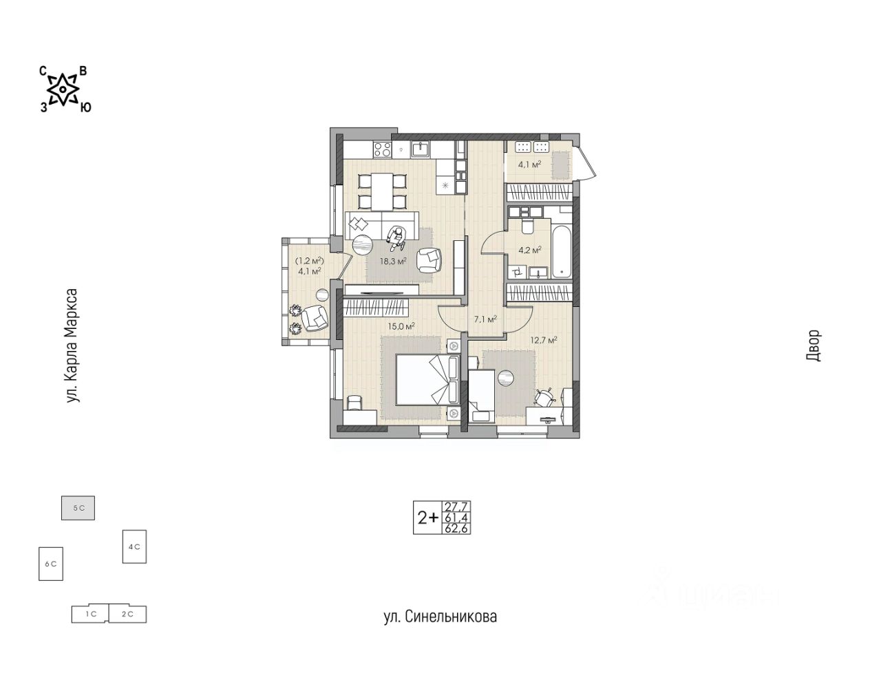 Окна на две стороны света обеспечат квартиру естественным освещением;
