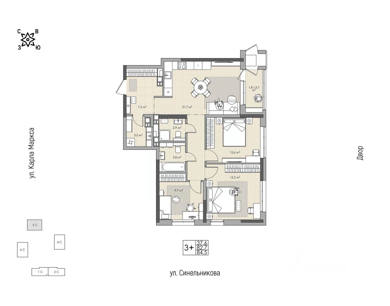 3,5-комнатная квартира для большой семьи с двумя детьми; Кухня-гостиная с лёгкостью вместит всю желаемуе мебель для готовки, отдыха и приёма гостей; Родительская мастер-спальня с собственным санузлом и гардеробной нишей; Детские спальни позволят делать расстановку мебели под "настроение"; Большое количество гардеробных ниш сэкономит деньги на покупку дополнительных шкафов и комодов; Окна на две стороны света обеспечат квартиры естественным освещением; Два санузла